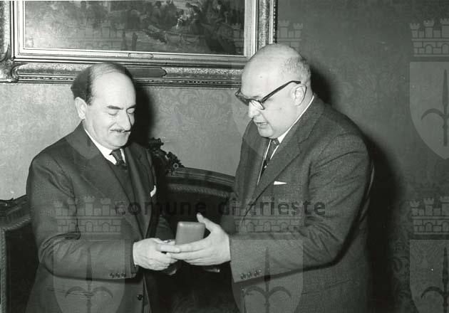Il Sindaco Mario Franzil riceve in Municipio il Premio Nobel per la Poesia Salvatore Quasimodo accompagnato dal presidente del C.C.A.