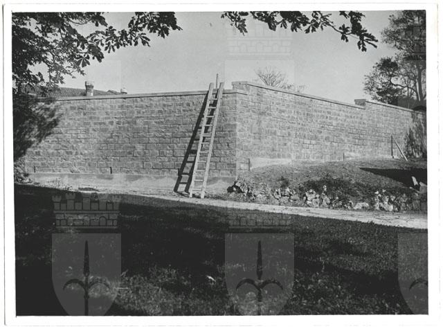 Parte interna edificio e giardino. Muro recinzione.