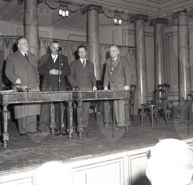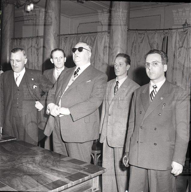 Celebrazione ufficiale il 19 marzo della Giornata nazionale del mutilato del lavoro al Ridotto del Verdi. Presente il grande invalido del lavoro, prof. avv. Filosi di Roma. Il prefetto Palutan, assistito dal direttore dell' INAIL dott. Benussi Gambel, distribuisce diplomi e distintivi agli invalidi e ai mutilati.