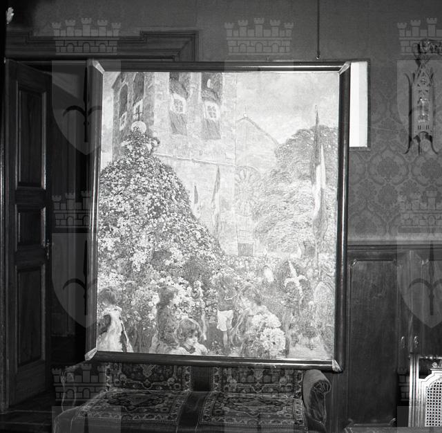 Due dipinti, Piramide di fiori a San Giusto di Ugo Flumiani e Le campane della redenzione di Carlo Wostry, fotografati in una sala del Civico Museo Morpurgo. Il dipinto di Wostry venne esposto per la prima volta al Caffe degli Specchi il giorno dell'annessione di Trieste all'Italia.