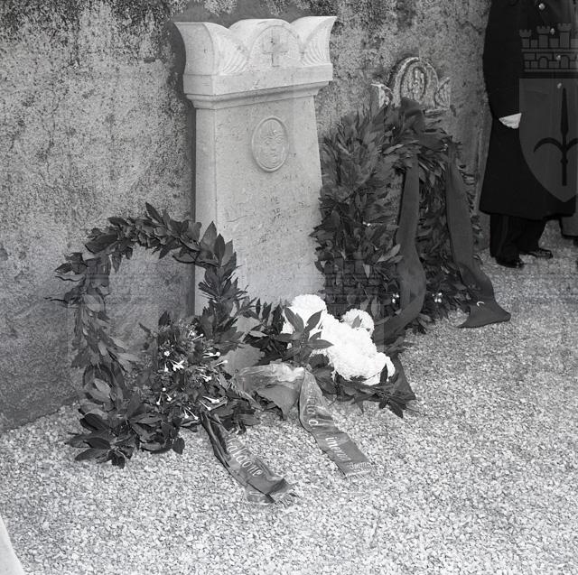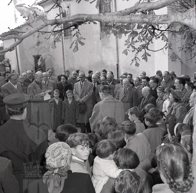 Scoprimento della lapide commemorativa in memoria di Antonio de' Giuliani posta sul sagrato della chiesa di Cattinara, a cura della casa editrice Lo Zibaldone di Anita Pittoni, della Societa di Minerva, sotto gli auspici del Comune. Sulla lapide medaglione raffigurante il de' Giuliani scolpito da Ruggero Rovan (da: La Bora, a. 2, n. 4, aprile 1978, p. 8-9)