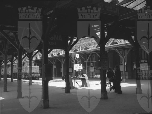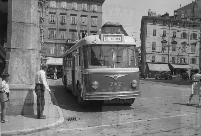 La vecchia pensilina della stazione centrale e la filovia della linea 5 in piazza Goldoni.