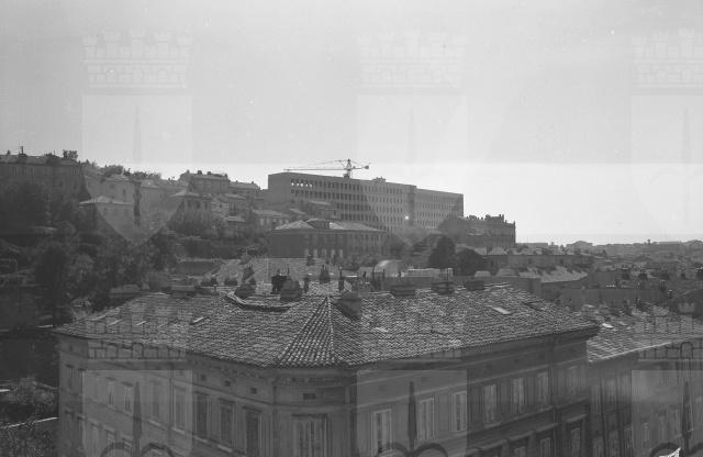 Il nuovo Poliambulatorio INAM di via Farneto fotografato da via Kandler. Il poliambulatorio presenta un innovativo impianto planimetrico a L. Sul retro: il sanatorio immerso nel giardino, sulla strada i sette piani destinati all'ambulatorio.