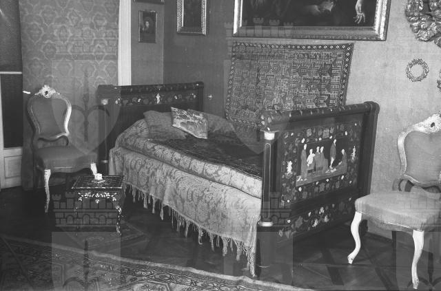 La splendida camera da letto di Draga Obrenovic, regina di Serbia, moglie del re Alessandro, composta da mobili olandesi intarsiati d'avorio. Draga e Alessandro, convolati a nozze nel 1900, furono assassinati la notte del 10 giugno 1903, proprio in questo letto: una congiura di palazzo pose fine alla dinastia degli Obrenovic, per insediare sul trono Pietro Karageorgevic. La camera appartenne a una nobile famiglia triestina e fu poi venduta a un celebre antiquario che la riallesti in una villa di viale Terza Armata, dove fu fotografata.