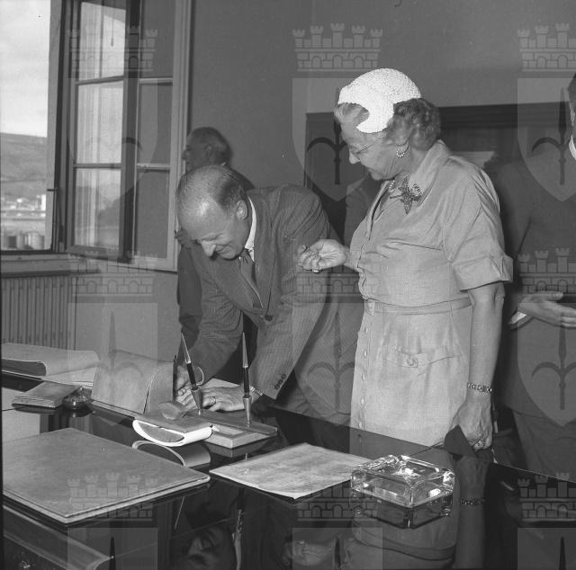 Il capo della Divisione dell'Industria della M.S.A. (Mutual Security Agency) di Roma, mr. Andrew Carey, giunto a Trieste in occasione della giornata della M.S.A. organizzata nell'ambito della manifestazioni della Fiera campionaria, visita la Raffineria Aquila, il Cotonificio San Giusto e il cantiere San Marco (da: Giornale di Trieste, 13 luglio 1953)