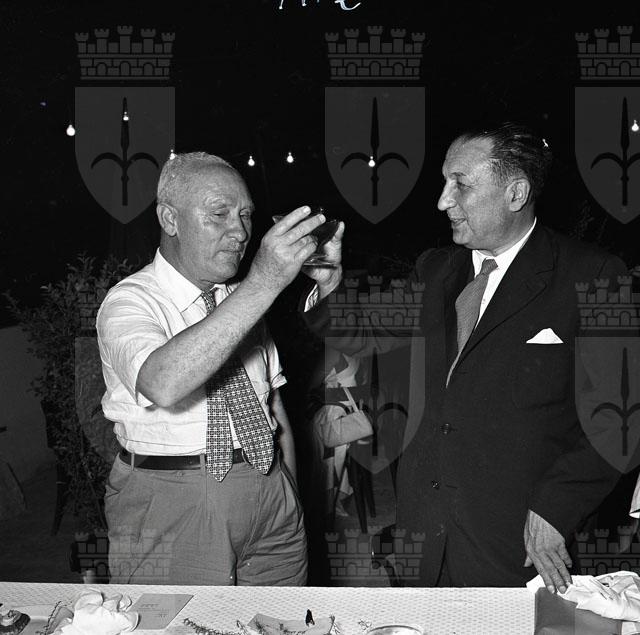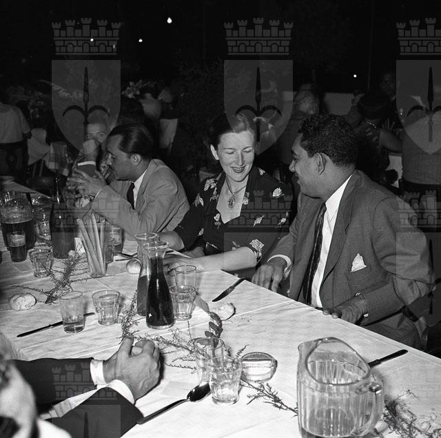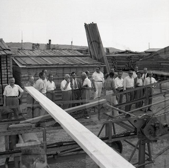 Visita dello stand della S.A. Forestale, lavorazione legnami. Gruppo di persone a cena