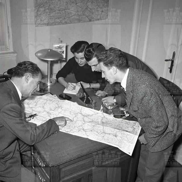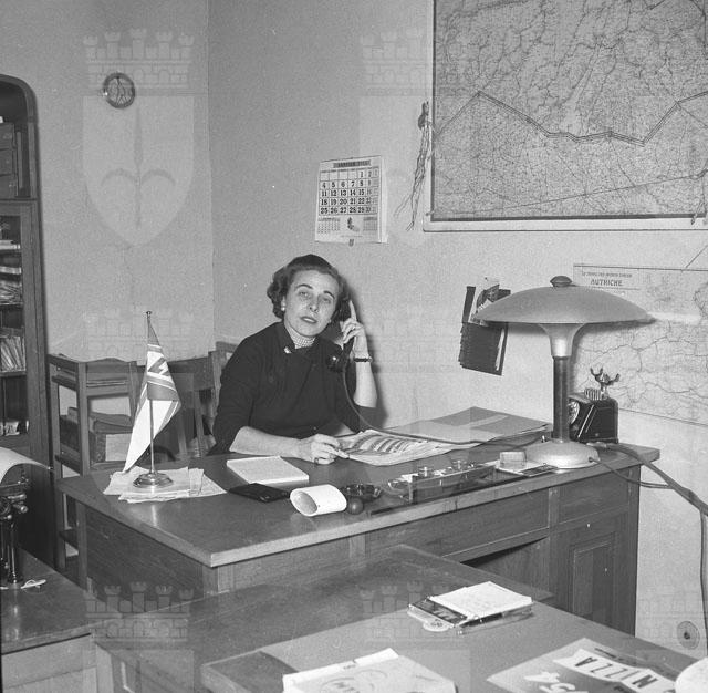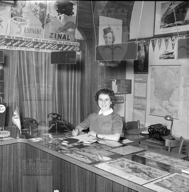 Servizio dedicato al personale dell'UTAT, agenzia di viaggi: gli impiegati posano per la fotografia, agli sportelli e negli uffici. Sulle lastre la vetrina dell'agenzia ricorda il ventennale di attività