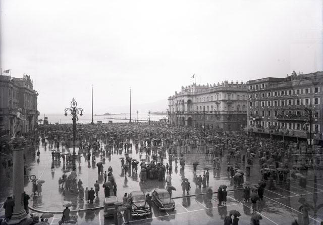 ln piazza Unita' d'Italia, sotto la pioggia, la folla attende l'arrivo delle truppe italiane.