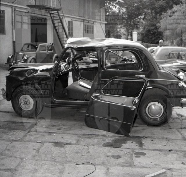 Immagini di una Fiat Millecento gravemente danneggiata.