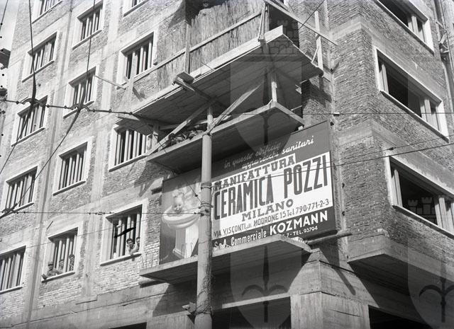 Riproduzione fotografica di un cartellone pubblicitario della Soc. commerciale Kozmann (impianti sanitari e igienici) su uno stabile in costruzione in via Udine.