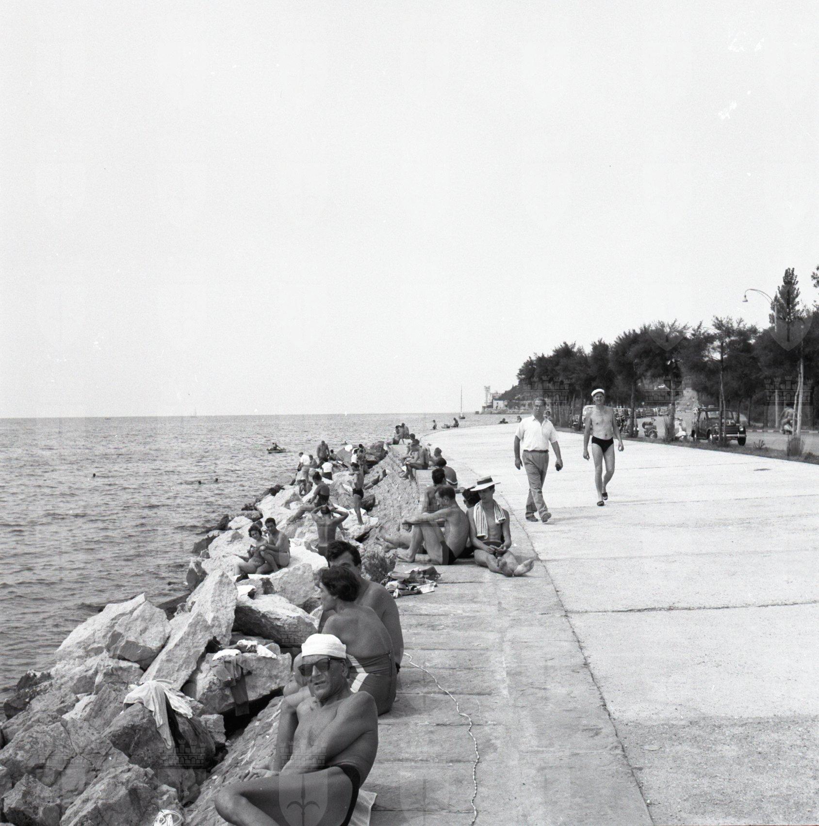 Bagnanti in scogliera; vedute di S. Giusto e fotografo; cassettista; turisti (anche sulle rive)