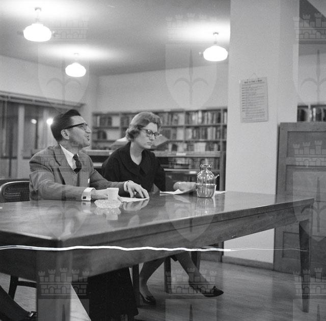 Leonard Sherwin, direttore delle biblioteche USIS in Italia, tiene una conferenza sul tema "SViluppi nell'impiego del film educativo negli Stati Uniti. Per tre anni il direttore aveva diretto l'attività di centri culturali in Giappone e promosso e coordinato la creazione di biblioteche in Indonesia e nella Malacca. Tratto da "Il Piccolo", 29 gennaio 1959