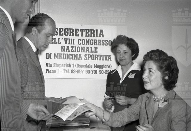 Nell'immagine un'insegna con la scritta Segreteria dell'VIII Congresso Nazionale di Medicina sportiva. Via Stuparich 1 (Ospedale Maggiore)
