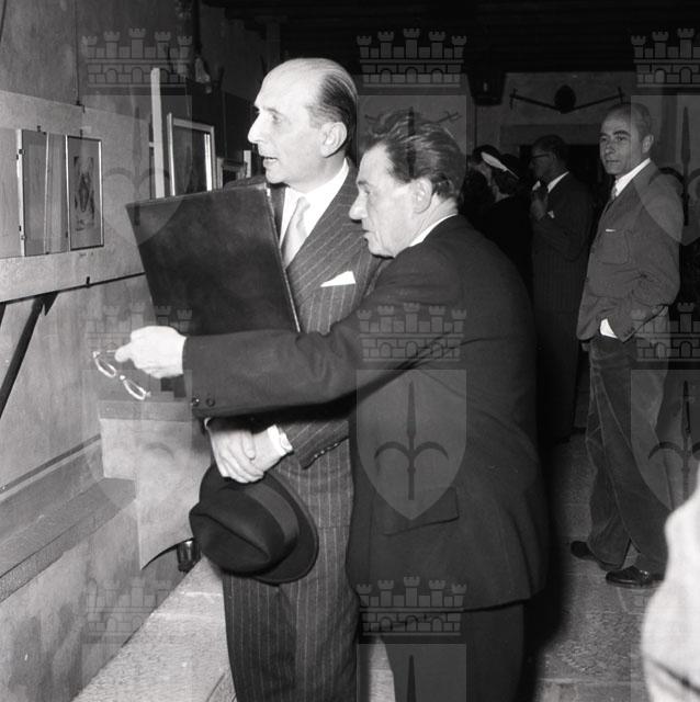 Inaugurazione della mostra al Castello di San Giusto. Presenti tra gli altri il consigliere politico italiano marchese Fracassi, il dott. Vitelli, il pittore Bergagna, il Sindaco Bartoli, il Vescovo Santin. Il Piccolo Sera 21.05.1954