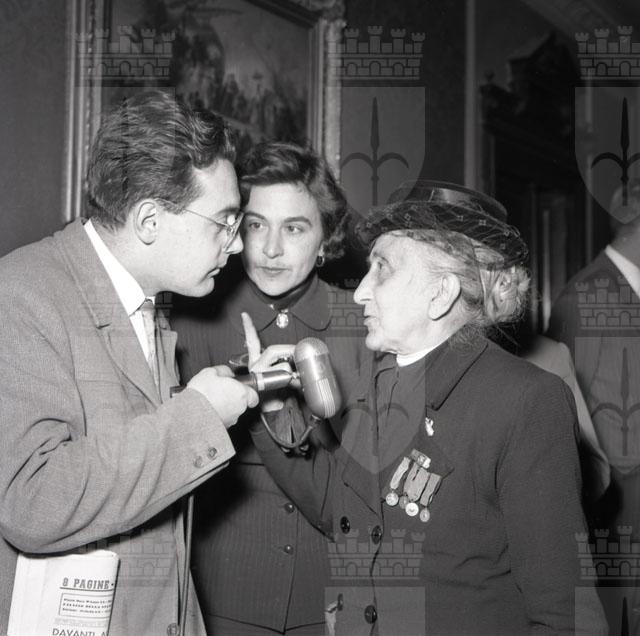 Una delegazione del Consiglio regionale sardo di cui fa parte Lello Muretti, Pierina Falchi, Giuseppe Colla oltre alla signora Giovanna Villa Santa, vedova del generale Riva decorato di medagli d'argento e madre della medaglia d'oro Alberto Riva, ultimo caduto della Grande Guerra, offre al sindaco alcuni bronzetti di ispirazione nuragica dello scultore D'Aspro quale espressione della fratellenza e dell'affetto che lega la Sardegna San Giusto.Il Sindaco ha ricambiato l'artistico dono offrendo alla delegazione sarda un vessillo rosso alabardato affinché sventoli accanto al tricolore che fu issato a San Giusto nel novembre del '18 e che oggi è custodito a Sassari. Testo tratto da Il Piccolo, 7.11.1954