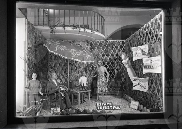 Le vetrine espongono l'ombrellone e sono titolate "Estate triestina"