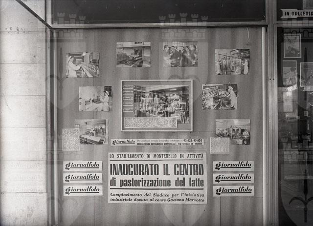 La vetrina propone le foto dell'inaugurazione a Montebello del nuovo stabilimento per la pastorizzazione del latte, costruito per iniziativa del conte Gaetano Marzotto e dotato di un'impiantistica all'avanguardia. Il conte Umberto Marzotto, presidente del Cda della Salpa, accoglie con grande cordialita' gli illustri convenuti, dichiarandosi lieto di poter contribuire in modo concreto all'economia della citta'. Al sindaco Bartoli viene riservato l'onore di bere il primo bicchiere prodotto. In un'altra occasione si esibiscono le foto della Cavalchina.