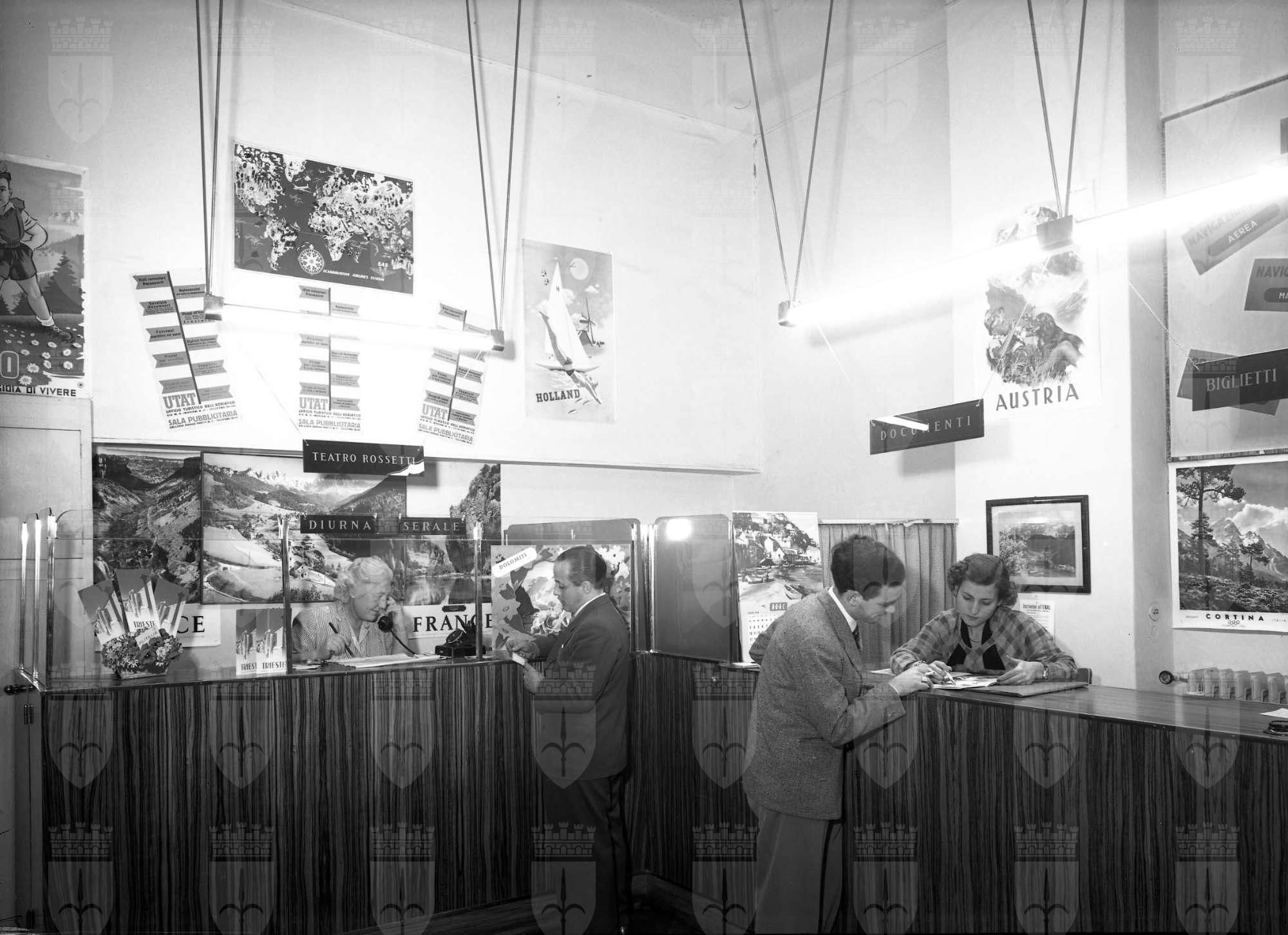 Servizio dedicato al personale dell'UTAT, agenzia di viaggi: gli impiegati posano per la fotografia, agli sportelli e negli uffici. Sulle lastre la vetrina dell'agenzia ricorda il ventennale di attività
