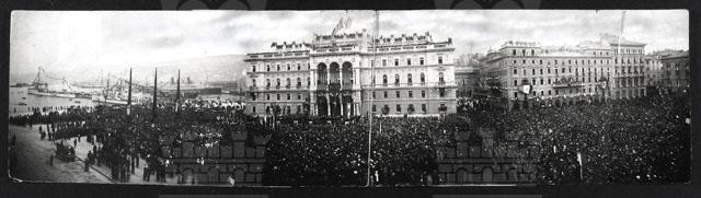 Straordinaria immagine, ottenuta unendo 3 fotografie, della piazza Unità di Trieste gremita di folla il 20 marzo 1921, quando si proclama solennemente l'annessione della Venezia Giulia all'Italia. Il re Vittorio Emanuele, impossibilitato a venire, manda un fervido saluto augurale. Si vedono le R.R. navi Duilio e Vittorio Emanuele.