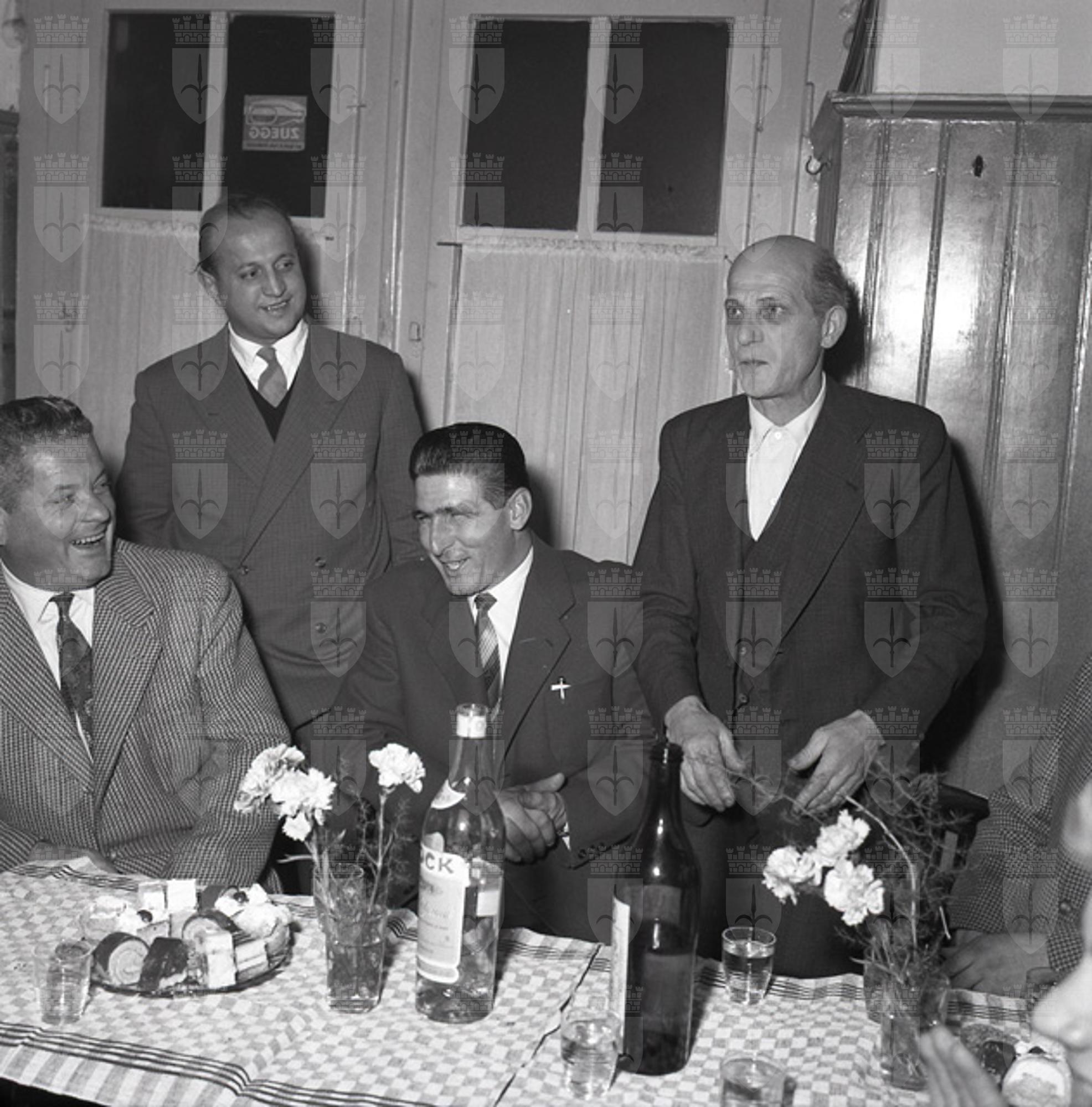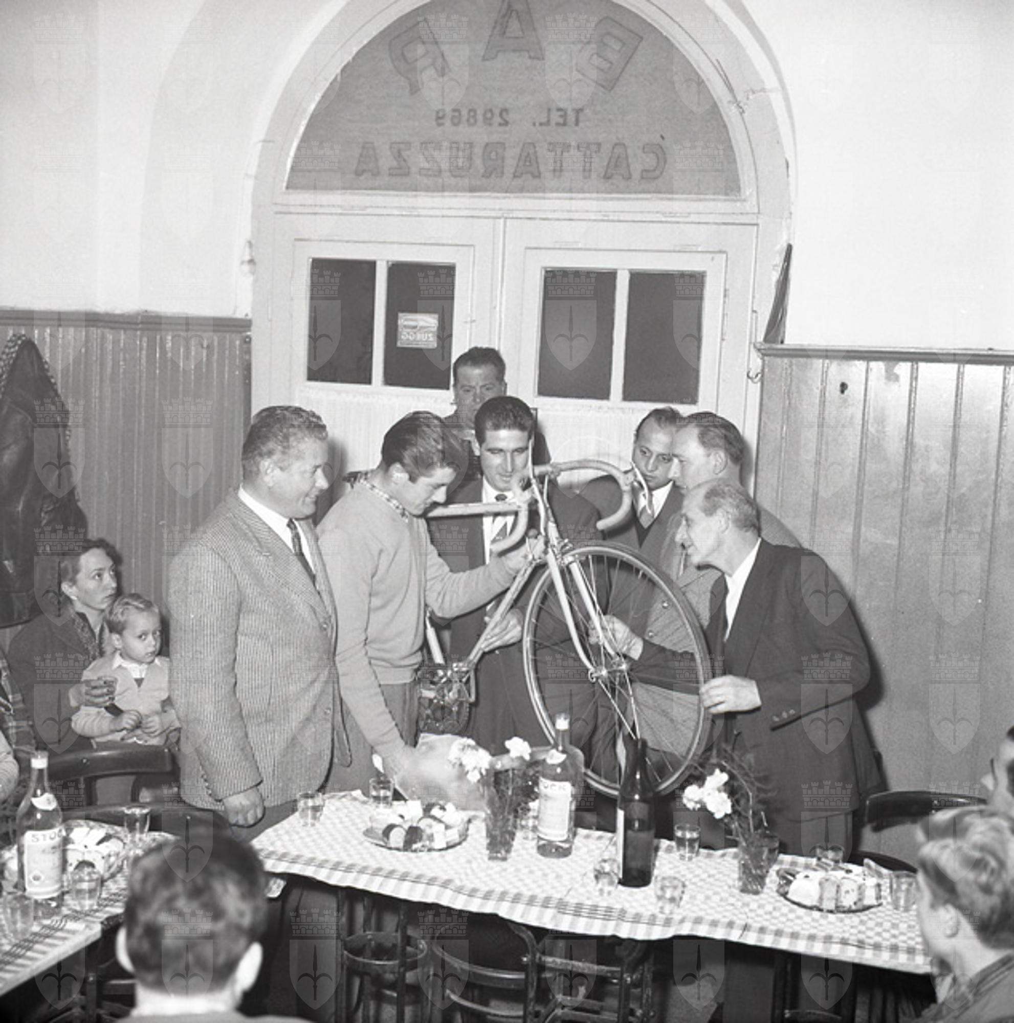 Guido De Santi consegna all'allievo Eligio Pelizon della Società Ciclistica Gino Bartali di Trieste la bicicletta donata dal campione di cui la società porta il nome al miglior atleta sociale della stagione. Il dono ha un particolare valore morale perché si tratta della bicicletta sulla quale Bartali corse il Tour de France 1949. Testo tratto da Il Piccolo Sera: Le ultime notizie del 22.11.1955.
