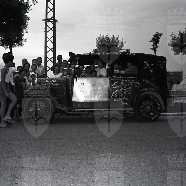 Alcune ragazze canadesi giungono a Barcola a bordo di una vecchia automobile. Sulla carrozzeria compaiono numerose scritte a testimonianza delle tappe toccate dal loro tour.