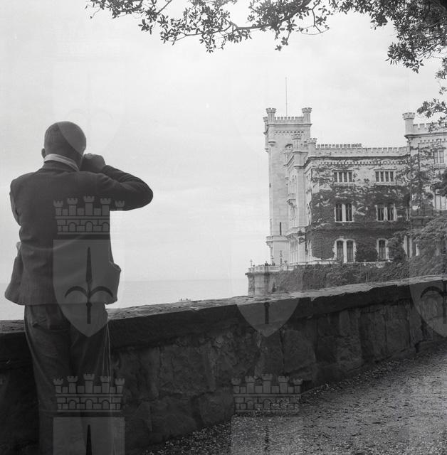 Castello di Miramare : Riflettori per spettacolo Luci e Suoni e turista fotografa