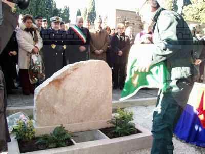Il sindaco Roberto Dipiazza con gli assessori comunali Roberto Menia e Fulvio Sluga ed il comandante della Capitaneria di Porto di Trieste Paolo Castellani, durante la cerimonia di traslazione dei resti del maro' Spartaco Schergat al cimitero ex militare presso il nuovo monumento eretto dal Comune di Trieste.