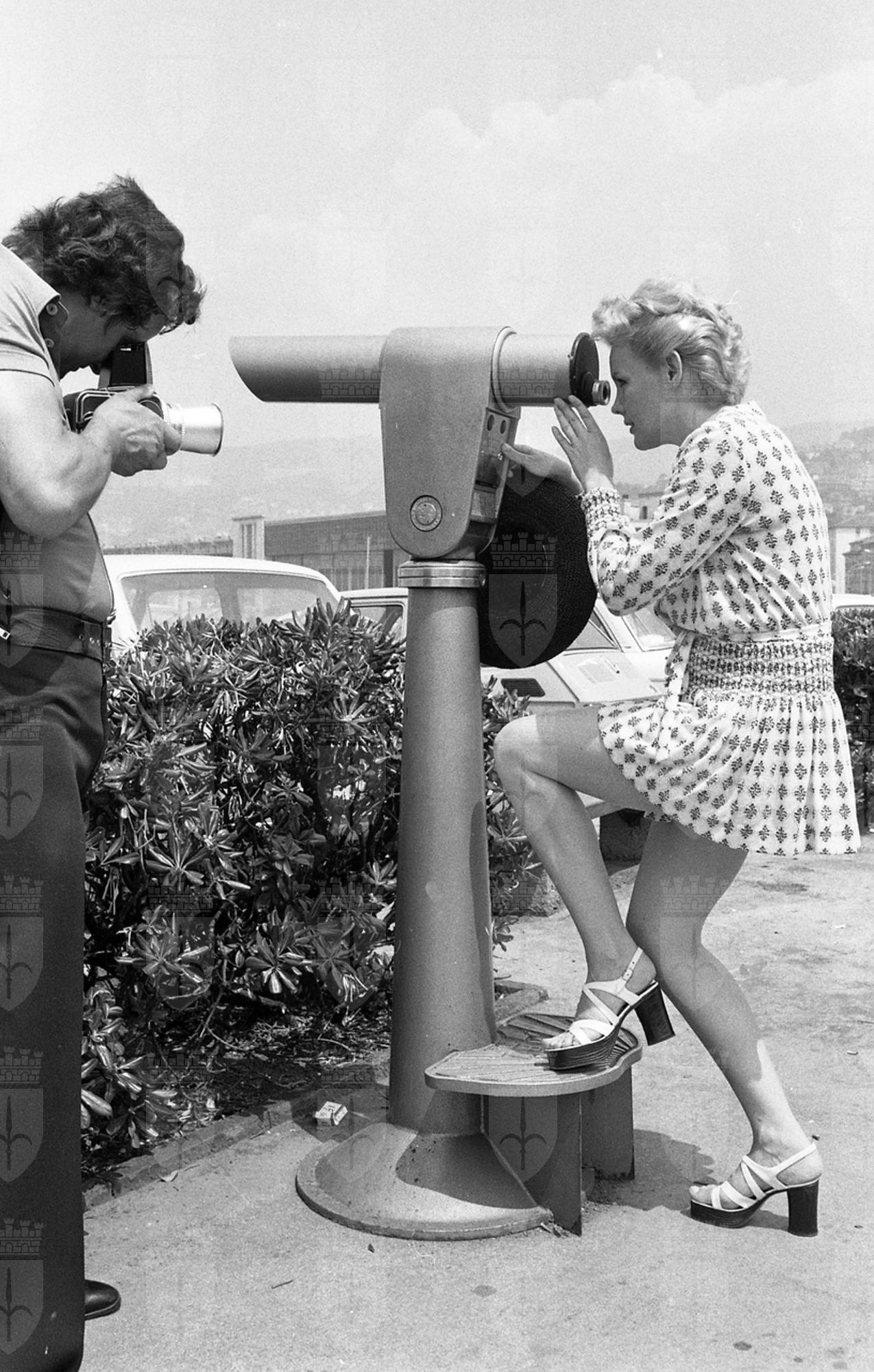 Caroll Baker assiste alla proiezione del film Baba Yaga del regista Corrado Farina insieme all'attrice Isabella da Funes.