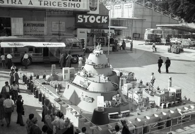 Riprese della Fiera campionaria dai cancelli esterni, dall'alto, davanti agli stand di Cosani Mobili di Tricesimo, della Stock e raffineria Aquila plastico abitazioni e serbatoi gas