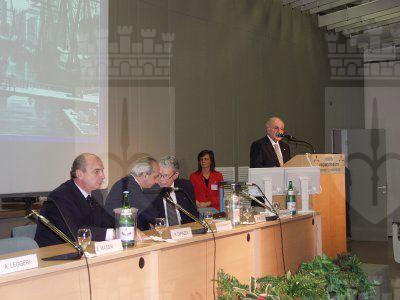 Il sindaco Roberto Dipiazza consegna il sigillo trecentesco al professor Umberto Senin, al tavolo della presidenza siedono l'assessore regionale alla sanità Gianni Pecol Cominotto e il professor Luciano Campanacci presidente dell'Associazione Medica Triestina