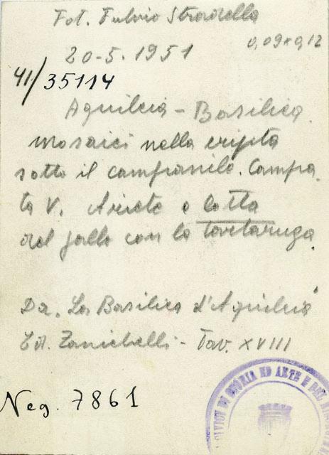 Particolari del mosaico che ornava l'aula nord della Basilica teodoriana di Aquileia. I due dettagli si riferiscono al pannello posto presso l'estremità orientale del vano, caratterizzato da una composizione ortogonale di ottagoni delineati adiacenti, formanti quadrati, con gli ottagoni campiti da motivi figurati e vegetali. È qui visible l'ottagono decorato con un ariete e l'iscrizione "Cyriace vibas" e quello con la scena della lotta tra il gallo e la tartaruga davanti a un pilastro sormontato dal vaso della vittoria. Tutt'attorno si dispongono i quadrati contenenti cerchi di quattro fusi ornati da quattro "ciuffi" di tre foglie, corone con "ciuffi" di tre foglie e quadrati con i lati concavi. Il pavimento si data al secondo decennio del IV sec. d.C.