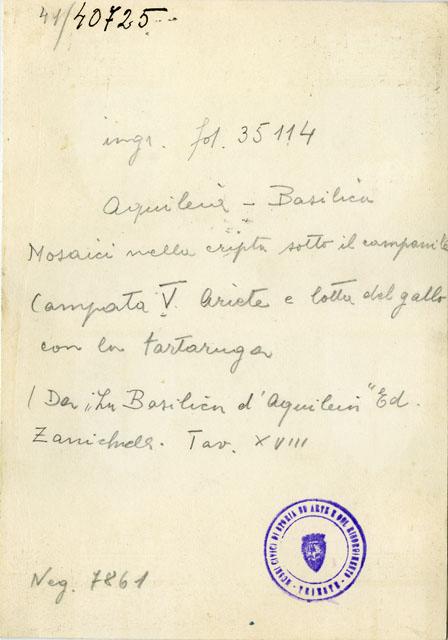 Particolari del mosaico che ornava l'aula nord della Basilica teodoriana di Aquileia. I due dettagli si riferiscono al pannello posto presso l'estremità orientale del vano, caratterizzato da una composizione ortogonale di ottagoni delineati adiacenti, formanti quadrati, con gli ottagoni campiti da motivi figurati e vegetali. È qui visible l'ottagono decorato con un ariete e l'iscrizione "Cyriace vibas" e quello con la scena della lotta tra il gallo e la tartaruga davanti a un pilastro sormontato dal vaso della vittoria. Tutt'attorno si dispongono i quadrati contenenti cerchi di quattro fusi ornati da quattro "ciuffi" di tre foglie, corone con "ciuffi" di tre foglie e quadrati con i lati concavi. Il pavimento si data al secondo decennio del IV sec. d.C.