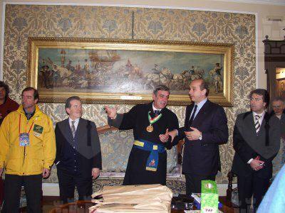 Il sindaco Roberto Dipiazza, l'assessore Maurizio Bucci e Roberto De Gioia presidente del Comitato «Trieste in Palio» incontrano il gruppo di maschere
