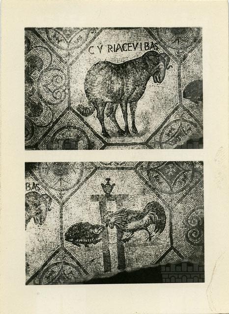 Particolari del mosaico che ornava l'aula nord della Basilica teodoriana di Aquileia. I due dettagli si riferiscono al pannello posto presso l'estremità orientale del vano, caratterizzato da una composizione ortogonale di ottagoni delineati adiacenti, formanti quadrati, con gli ottagoni campiti da motivi figurati e vegetali. È qui visible l'ottagono decorato con un ariete e l'iscrizione "Cyriace vibas" e quello con la scena della lotta tra il gallo e la tartaruga davanti a un pilastro sormontato dal vaso della vittoria. Tutt'attorno si dispongono i quadrati contenenti cerchi di quattro fusi ornati da quattro "ciuffi" di tre foglie, corone con "ciuffi" di tre foglie e quadrati con i lati concavi. Il pavimento si data al secondo decennio del IV sec. d.C.
