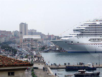 Vedute delle rive con la nave da crociera Carnival Conquest attraccata al molo della Stazione Marittima.