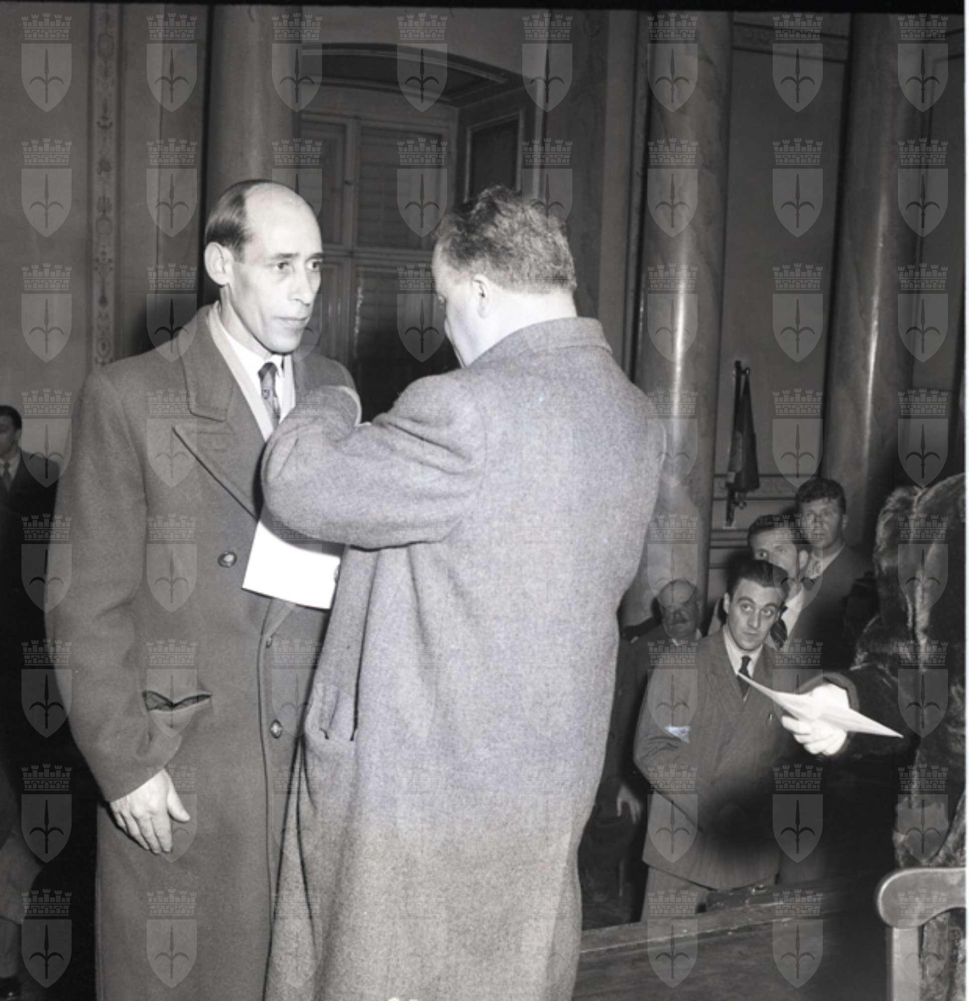 Celebrazione ufficiale il 19 marzo della Giornata nazionale del mutilato del lavoro al Ridotto del Verdi. Presente il grande invalido del lavoro, prof. avv. Filosi di Roma. Il prefetto Palutan, assistito dal direttore dell' INAIL dott. Benussi Gambel, distribuisce diplomi e distintivi agli invalidi e ai mutilati.