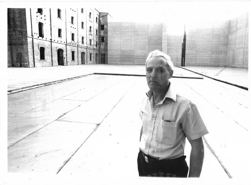 Mario Montanaro in cortile. Edificio camerate prigionieri e "Pietà" sullo sfondo