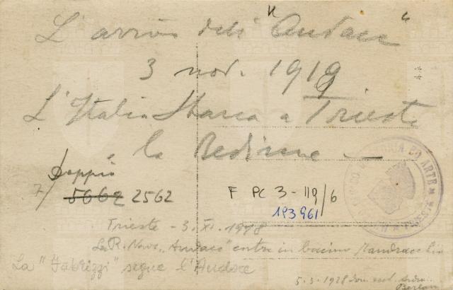 "Fabrizi" e "Audace" si riferiscono al cacciatorpediniere "Nicola Fabrizi" e all'incrociatore Audace, che entrarono a Trieste il 3 novembre 1918, segnando l'annessione della città all'Italia dopo la Prima Guerra Mondiale.
