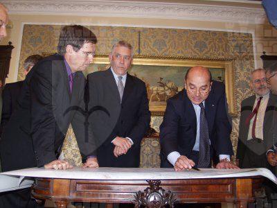 Il sindaco Roberto Dipiazza con l'asssessore comunale Giorgio Rossi durante la presentazione nel Salotto azzurro del Municipio.