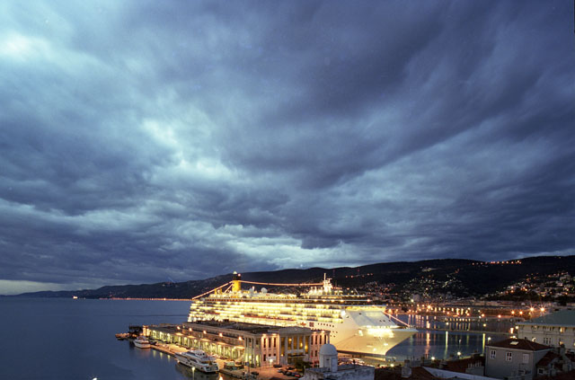 Stazione marittima, nave crociera, Costa Atlantica, rive di Trieste, notturni, pescheria, foto artistiche, turisti, piazza Unità notturni, rive.