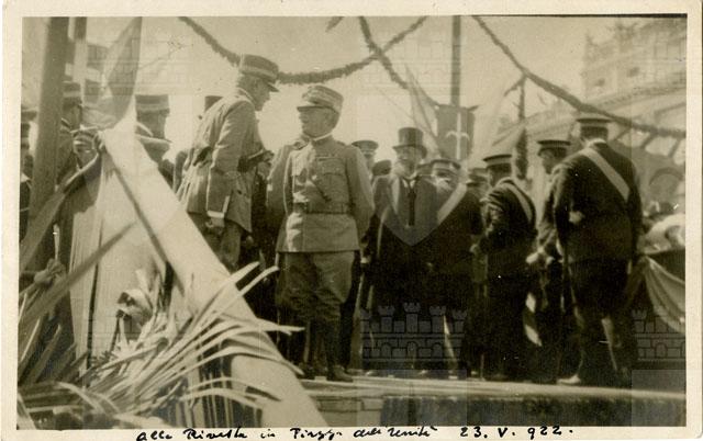 Vittorio Emanuele III, la regina Elena e la principessa Iolanda alla rivista militare in piazza dell'Unità d'Italia il 23 maggio 1922. Vi si vedono il Re e il Duca d'Aosta sul palco allestito in piazza.