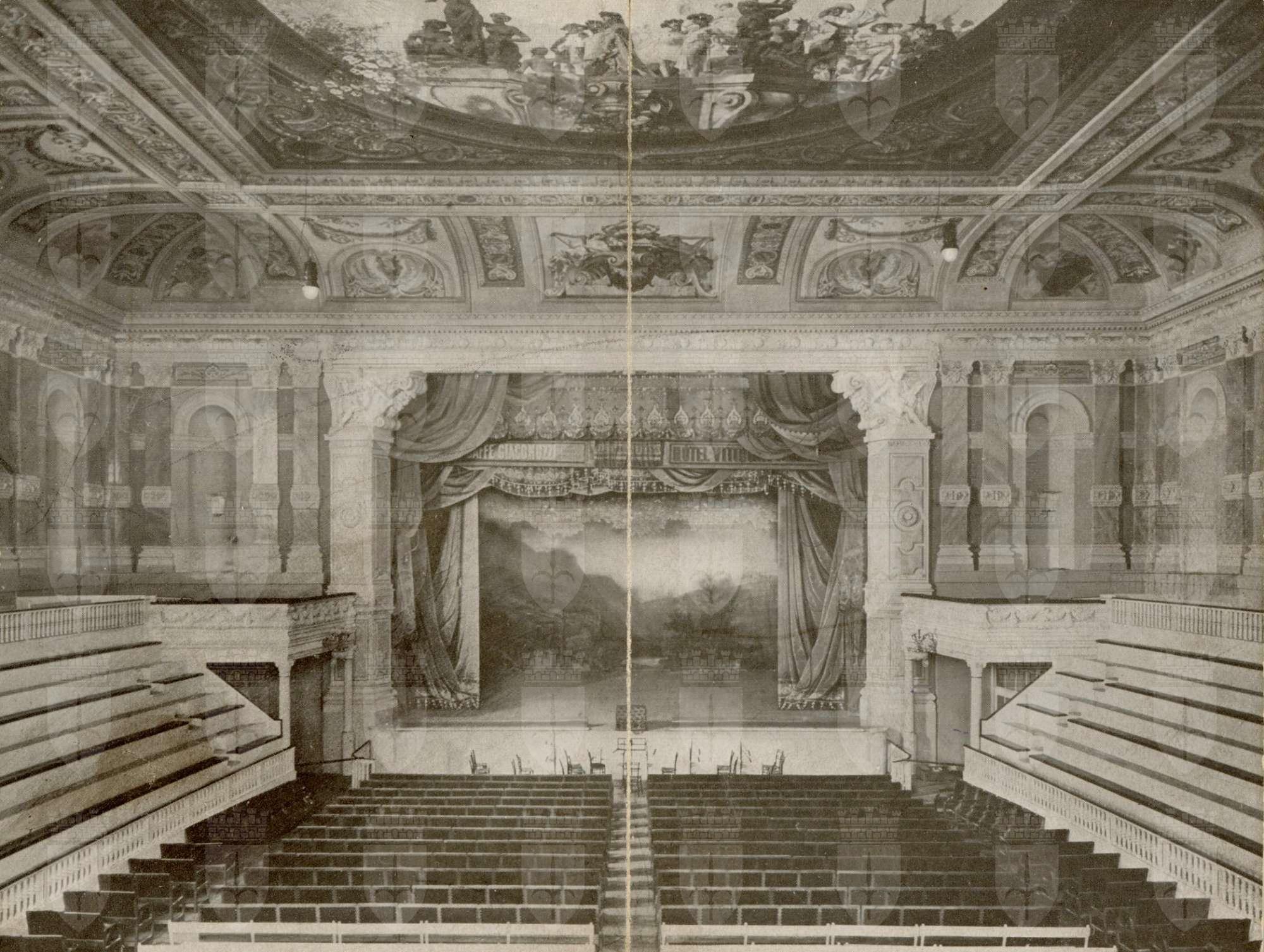 Interno della sala del Teatro Fenice di Trieste, già Anfiteatro Mauroner, qui nella ristrutturazione del 1905. I proprietari del teatro, i fratelli Herrmanstorfer, affidano all'architetto triestino Ruggero Berlam il progetto della sala. Nelle nicchie, a fianco del palcoscenico, non sono ancora collocate la statue che saranno realizzate dallo scultore Resmann.