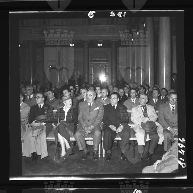 Consegna delle medaglie d'oro conferite dalla Camera di commercio a 35 lavoratori con oltre quarant'anni di anzianità di servizio, e a 20 ditte triestine commerciali e industriali. Le medaglie alle ditte sono cosi ripartite: 14 a ditte che hanno documentato un'attività ininterrotta dai 50 agli 80 anni; 5 a ditte con un minimo di 25 anni di attività ininterrotta; 1 a una ditta che ha dimostrato di aver apportato importanti miglioramenti di carattere tecnico e sociale (dal Giornale di Trieste, 01.06.1953)