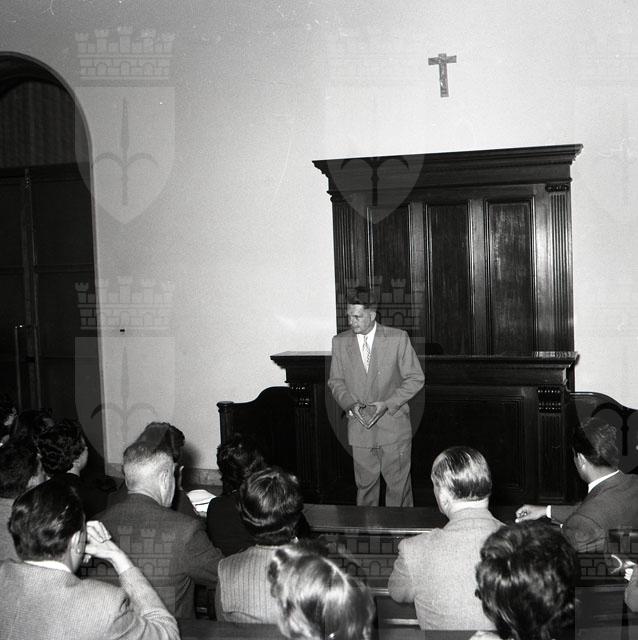 Il docente di lingue moderne tiene una conversazione sui caratteri generali del corso per la specializzazione di traduttore estemporaneo di lingue straniere previsto all'Università di Trieste per l'anno accademico 1954-1955.Testo tratto da Le ultime notizie, 25.09.1954.