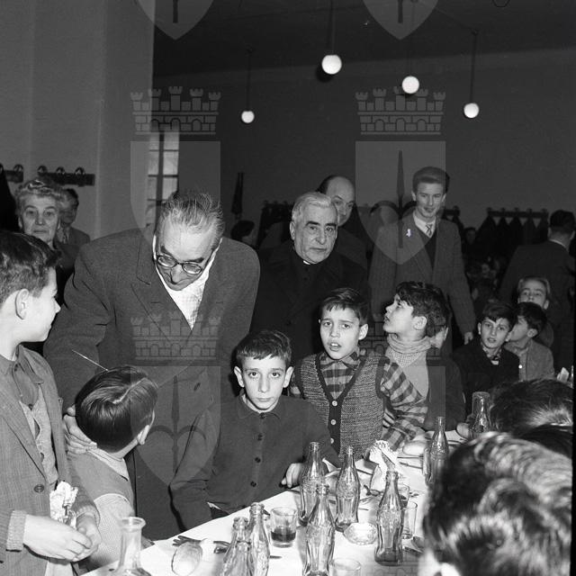 Oltre 700 bambini di eta inferiore ai 12 anni, profughi giuliano-dalmati, appartenenti alle classi piu indigenti, partecipano ad un pranzo natalizio offerto dal locale Ente organizzatore dell'Amministrazione per gli aiuti internazionali, nei locali della mensa comunale di via Gambini