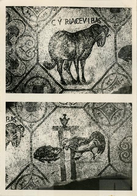 Particolari del mosaico che ornava l'aula nord della Basilica teodoriana di Aquileia. I due dettagli si riferiscono al pannello posto presso l'estremità orientale del vano, caratterizzato da una composizione ortogonale di ottagoni delineati adiacenti, formanti quadrati, con gli ottagoni campiti da motivi figurati e vegetali. È qui visible l'ottagono decorato con un ariete e l'iscrizione "Cyriace vibas" e quello con la scena della lotta tra il gallo e la tartaruga davanti a un pilastro sormontato dal vaso della vittoria. Tutt'attorno si dispongono i quadrati contenenti cerchi di quattro fusi ornati da quattro "ciuffi" di tre foglie, corone con "ciuffi" di tre foglie e quadrati con i lati concavi. Il pavimento si data al secondo decennio del IV sec. d.C.