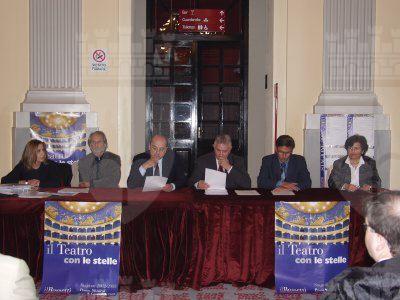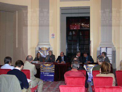 Il sindaco di Trieste Roberto Dipiazza con l'asssessore comunale Giorgio Rossi, il consigliere Paolo Rovis e l'architetto responsabile del progetto Luciano Celli durante la presentazione presso il Politeama Rossetti.