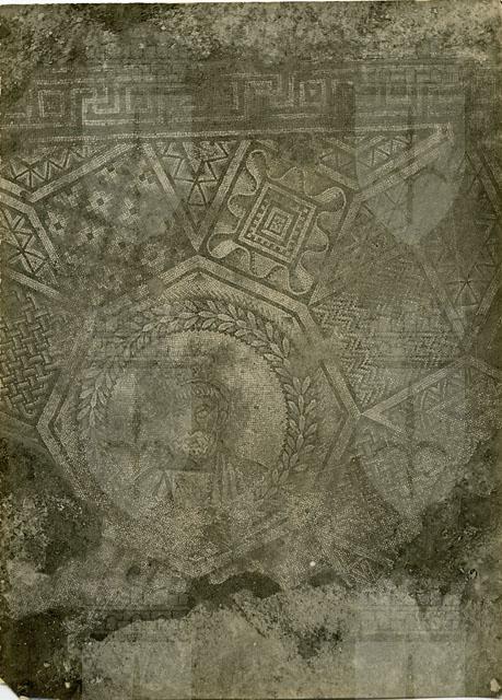 Particolare del mosaico che ornava il complesso noto in letteratura con il nome di "Grandi Terme", costruito ad Aquileia nel settore sud-occidentale della città antica in età tardocostantiniana. L'edificio, messo in luce negli anni Venti e attualmente in corso di scavo da parte dell'Università di Udine, è noto solo parzialmente: si conosce un ampio "frigidarium", collocato idealmente al centro del complesso, collegato in corrispondenza dei lati brevi mediante due lunghi corridoi a due aule simmetricamente opposte e di identiche dimensioni, interpretate come palestre "apodyteria". A est del frigidario era situata la piscina mentre alcune emergenze poste a ovest sembrerebbero riconducibili alla zona del calidario tepidario. Completavano il complesso una serie di altri vani, alcuni dei quali riscaldati, posti nelle immediate vicinanze delle due ampie palestre. Le terme erano dotate di un ricco apparato decorativo di cui rimane testimonianza nei rivestimenti in marmo e in mosaico, come si evince dalla foto in esame. Il particolare qui riprodotto ornava l'aula Nord, caratterizzata da una composizione musiva piuttosto articolata (identica, nell'organizzazione, a quella dell'aula Sud): attorno a un grande quadrato centrale decorato da Nettuno sul carro si disponevano sedici pannelli campiti da fitti ornati geometrici impreziositi da personaggi del mondo marino, tra cui Nereidi e Tritoni, e figure di atleti. Chiudevano la decorazione in corrispondenza dei lati brevi due pannelli rettangolari, lunghi come l'ambiente, decorati da soggetti maschili, da interpretare verosimilmente come atleti. La porzione di tessellato qui riprodotta apparteneva al pannello musivo che delimitava la composizione a nord, decorato da una composizione di ottagoni stellati e quadrati, formanti losanghe e triangoli negli spazi di risulta, con gli ottagoni campiti da busti maschili in proporzioni maggiori del vero. Degli originari cinque ottagoni se ne conservano solo quattro, di cui quello della foto in esame rappresenta quello centrale: mostra un personaggio anziano ammantato, caratterizzato da una folta barba bianca riccioluta e capelli a frange, con il capo adorno di una corona decorata da tre testine. Il mosaico si data al secondo quarto del IV sec. d.C.