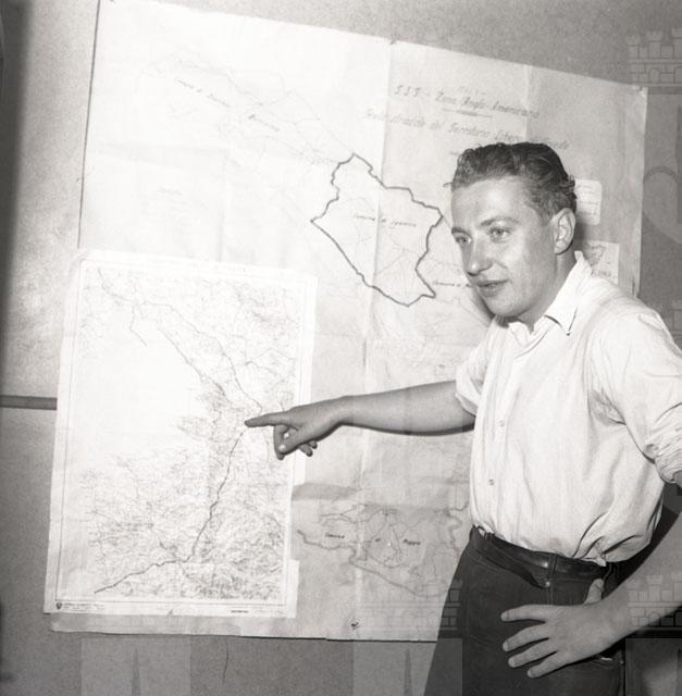 Ragazzo immortalato davanti a una mappa della zona occupata dal Governo militare alleato.