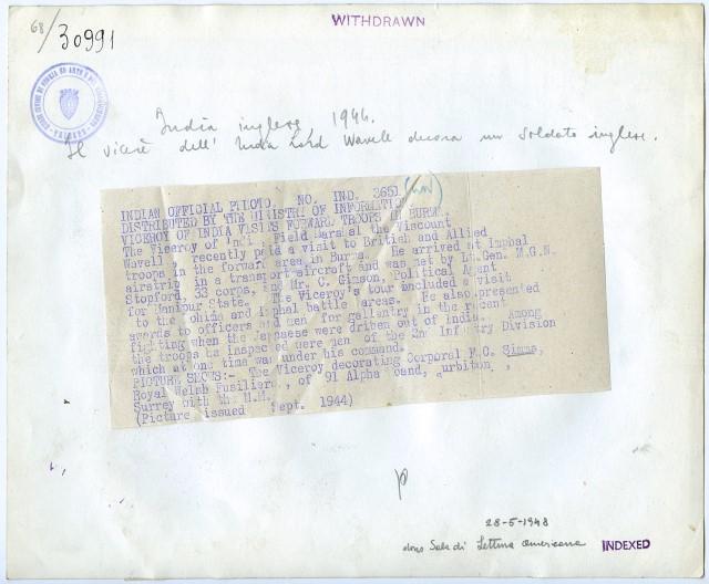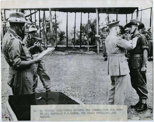 Wavell, Archibald Percival, visconte di Winchester e di Cirenaica, lord. - Generale (Colchester 1883 - Londra 1950). Partecipò alla guerra contro i Boeri (1899-1902) e alla prima guerra mondiale, servendo poi in Egitto con il gen. E. H. H. Allenby e nel corpo di occupazione sul Reno (1919-20). Richiamato al War Office e inviato più tardi in Rhodesia del Sud, nel 1939 fu nominato comandante in capo delle forze britanniche nel Medio Oriente. In tale veste diresse le operazioni contro gli Italiani in Cirenaica (dic. 1940 - genn. 1941) e in AOI (genn.-maggio 1941) costringendoli alla ritirata; ma non riuscì ad arrestare l'invasione tedesca della Grecia e di Creta, né a fermare le truppe di Rommel in Nord Africa. Trasferito (luglio 1941) al comando in capo delle forze britanniche delle Indie, dovette indietreggiare di fronte all'avanzata giapponese in Malesia, Singapore e Burma. Lasciato il comando nel giugno 1943, fu promosso maresciallo di campo e nominato vicerè dell'India, carica che mantenne fino al 1947. Notizia desunta da: http://www.treccani.it/enciclopedia/wavell-archibald-percival-visconte-di-winchester-e-di-cirenaica-lord La fotografia rappresenta l'attribuzione di un'onorificienza al caporale F.C. Simms, fuciliere reale gallese.